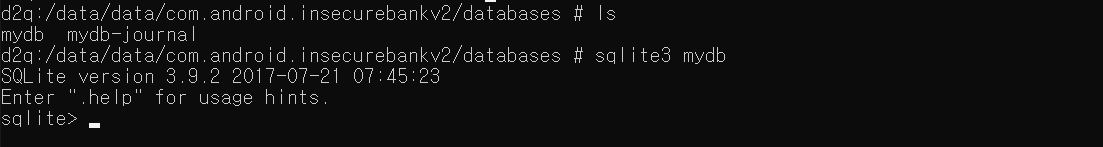 1. /data/data/com.android.insecurebankv2 경로로 오셔서 databases 폴더에 들어가시면 mydb , mydb-journal 이라는 DB파일 두개가 보일 것입니다. 저는 mydb 를 살펴보겠습니다.