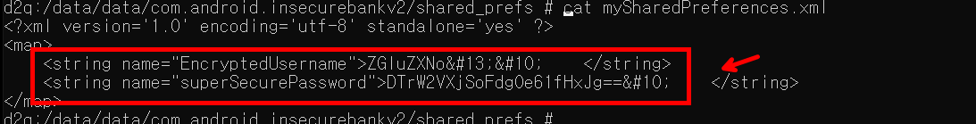 3. mySharedPreferences.xml 파일은 계정의 아이디와 비밀번호를 암호화하여 저장한 파일이였습니다. 이 암호화같은 경우는 하드코딩 취약점이나 로컬 암호화 취약점 이슈로 복호화가 가능하다는 것을 지난번 포스팅에서 보여드렸습니다.