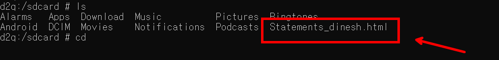 2. sdcard 디렉토리에 접근후 ls 명령어를 통해 파일들을 살펴보자 기본 설치파일 이외에 Statements_dinesh.html 이라는 낯선 파일이 보입니다. 이 파일을 열어보겠습니다.