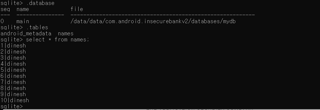 3. 사진을 보시면 아래의 명령어들을 순차적으로 입력하여 DB명 , 테이블 명 , DB내용 까지 추출한 것을 보실 수 있습니다. 보니깐 로그인한 내역을 저장하는 db인것 같습니다. 물론 기기에서 직접적으로 database 디렉토리에 접근이 불가능해서 이 자체로는 문제가 안되겠지만 앞서 배웠던 콘텐츠 프로바이더 취약점 과 연계가 된다면 충분히 위험할 수 있는 사항이니 DB에 비밀번호나 아이디 저장시 반드시 암호화를 진행한 후 저장해야 합니다.