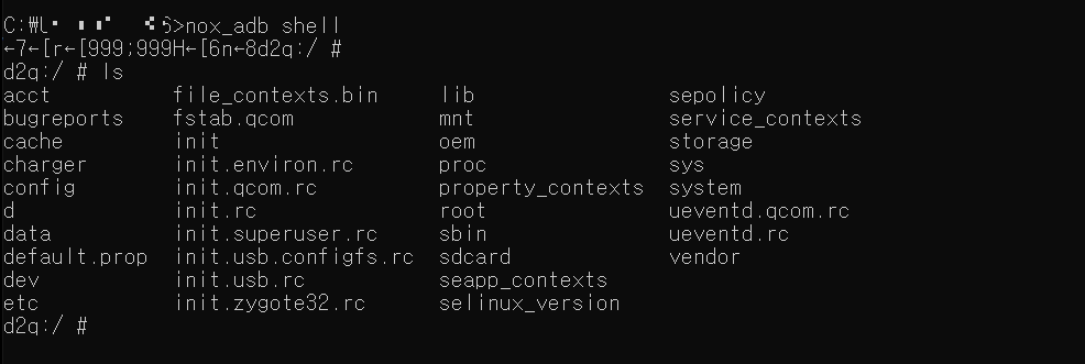 1. 우선 adb를 사용하여 NOX기기에 명령어창을 접속을 합니다.