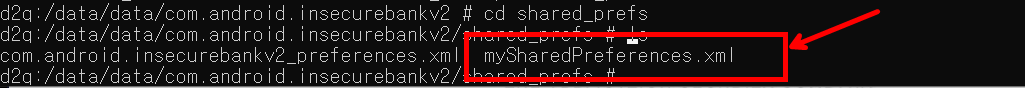 2. SharedPreferences 파일 확인을 위해 shared_prefs 폴더로 이동했습니다. 보아하니 xml 파일 두개가 존재하는데 저는 mySharedPreferences.xml 파일이 열어보고 싶네요. cat 명령어로 살펴보겠습니다.
