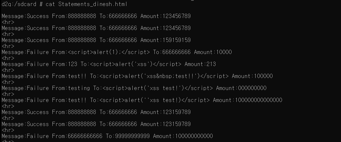 3. 보아하니 이 파일은 송금 내역을 저장하는 파일인 것 같습니다. 해당 파일엔 제가 송금했던 내역과 xss 공격을 시도했던 흔적들이 그대로 남아있습니다. sdcard 디렉토리는 외부앱에서도 접근이 가능하기 때문에 이런 정보를 저장해서는 절대 안됩니다.