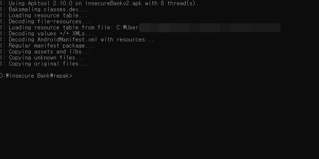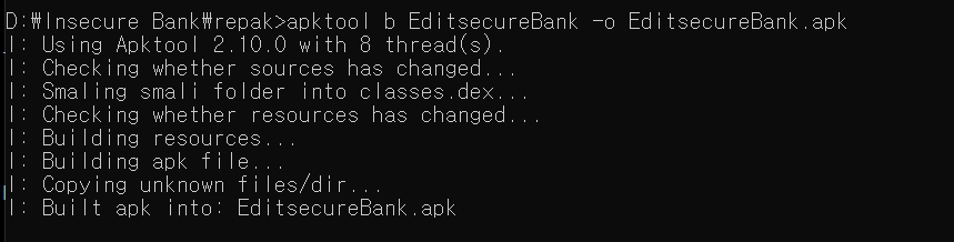 8. 해당 명령어를 통해 수정된 디컴파일 폴더를 다시 apk 파일로 변환시켜줍니다. (리패키징)