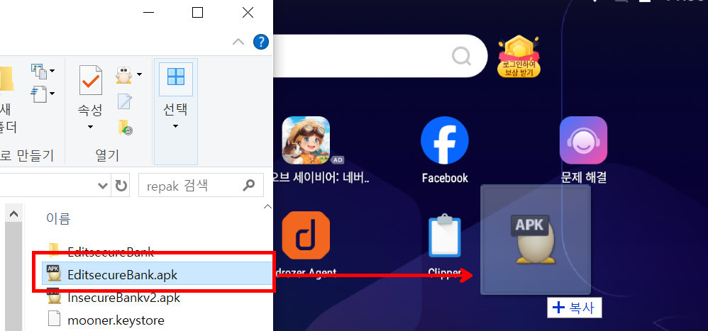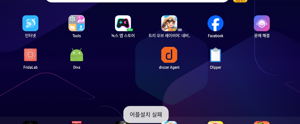 | 드래그 앤 드롭으로 리패키징 어플 설치 시도 | 어플설치 실패 문구 확인 |