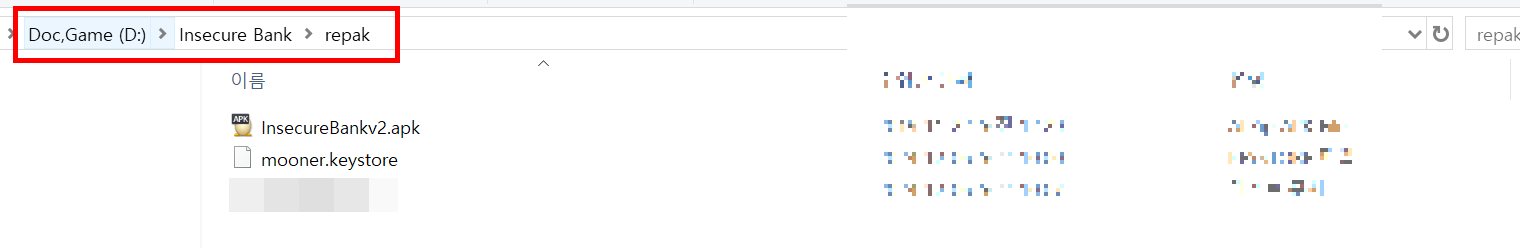 3. 이후 위에 링크 내용대로 서명키를 생성하게 되면 이와같이 keystore 라는 파일이 생성이 되게 됩니다. 저는 repak 이라는 폴더에 InsecureBankv2.apk(원본파일) 를 넣어주고 keystore 파일을 만들어주었습니다. 이렇게 셋팅하면 리패키징을 할 준비가 완료되었습니다!