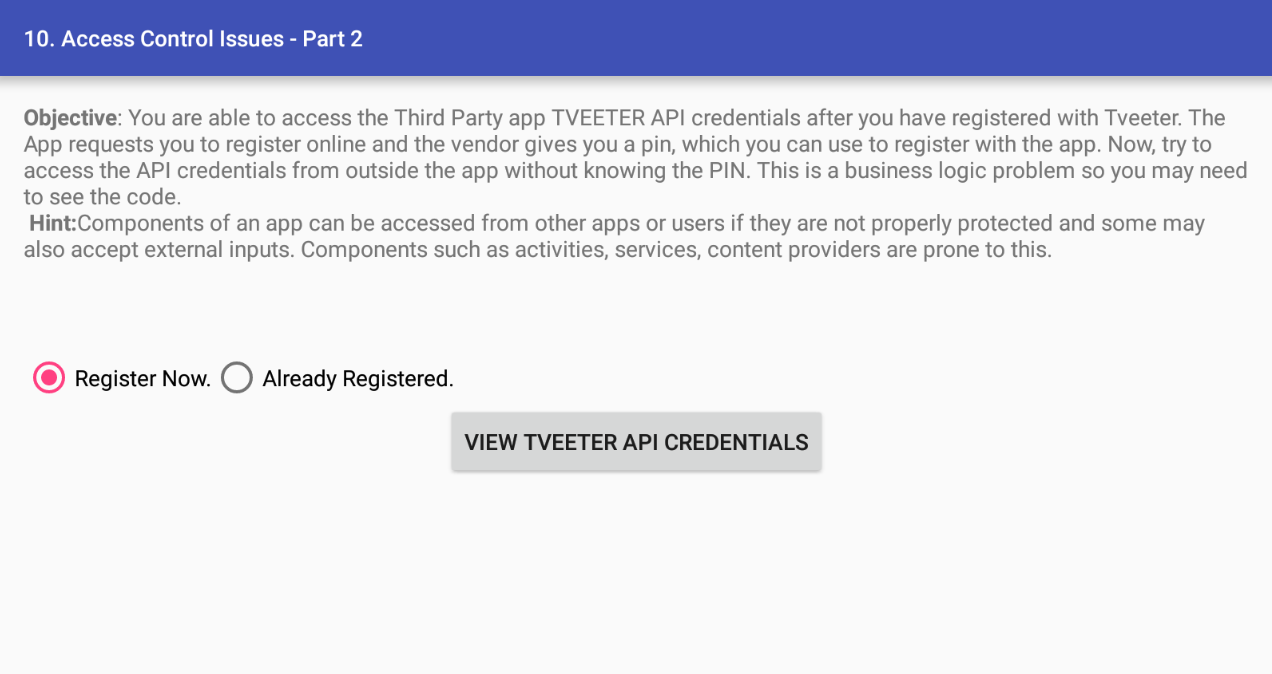 > 접근 제어 이슈라고도 하는 이 취약점은 제 기준으로는 웹 해킹으로 따지면 불충분한 인가 취약점에 가깝습니다. 예를들어 관리자 페이지로 이동하는 특정 동작이 있는데 이를 앱 외부에서 호출하여 관리자가 아니더라도 우회하여 접근할 수 있는경우 , PIN 번호를 입력해야 동작하는 것을 PIN번호 없이 동작시킬 수 있는 경우가 있습니다.