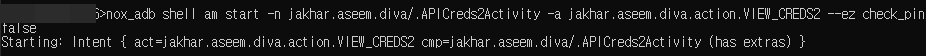 > nox_adb shell am start -n jakhar.aseem.diva/.APICreds2Activity -a jakhar.aseem.diva.action.VIEW_CREDS2 --ez check_pin false