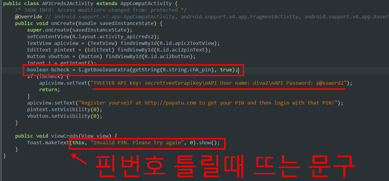 4. 핀번호 틀릴때 뜨는 문구가 있는것을 보니 여기가 저희가 우회해야할 PIN번호 입력 액티비티 인것 같습니다. 보시면 아까 putExtra를 통해 전달해준 chk_pin 이라는 boolean 변수값을 Intent에서 가져와서 bcheck 에 넣습니다. 그리고 bcheck 가 true면 PIN번호가 틀렸다고 뜨고 , false 면 API정보를 반환하는것 같습니다. 즉 저희는 저 bheck를 false로 만들어야 하는겁니다!
