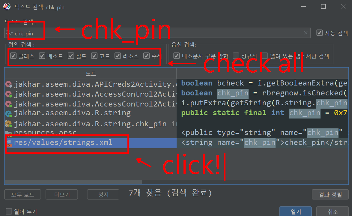 6. Jadx 에서 텍스트 검색을 키신후 chk_pin 이라고 검색해주세요. 여기서 검색창 밑에 정의 검색 부분을 전부 체크해주셔야 낱낱이 볼수 있습니다. res/values/strings.xml 에 chk_pin 에 대한 정의가 되어있는것 같으니 클릭합니다.