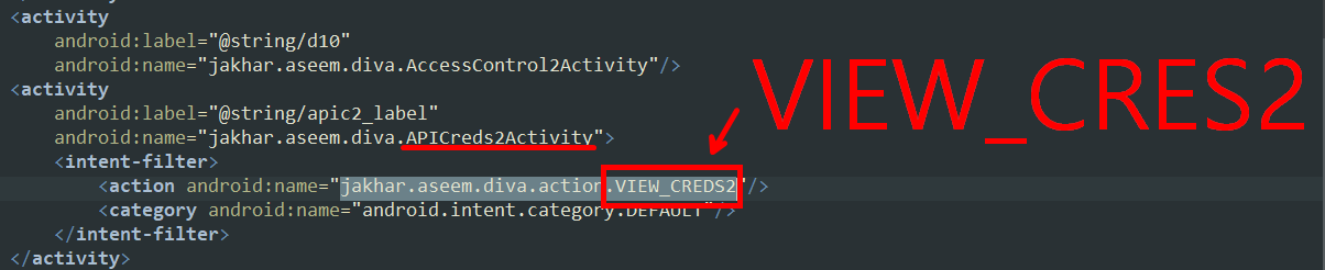 <action android:name="jakhar.aseem.diva.action.VIEW_CREDS"/>