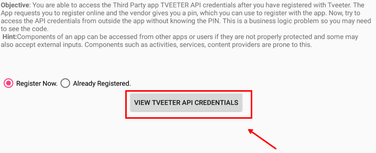 1. 일단 Access Control Issues - Part2 문제에 들어왔습니다. 문제 의도는 API 정보를 얻으려면 우선 Tveeter 이란곳에 가입을 한 후 , PIN 번호를 받아야 API 정보를 볼 수 있다고 합니다. 즉! 이 PIN번호가 없는상태로 외부에서 API 정보에 접근해라! 입니다. 일단 RadioButton 이 있으니 각각의 경우에 어떻게 나오는지 확인해보겠습니다.