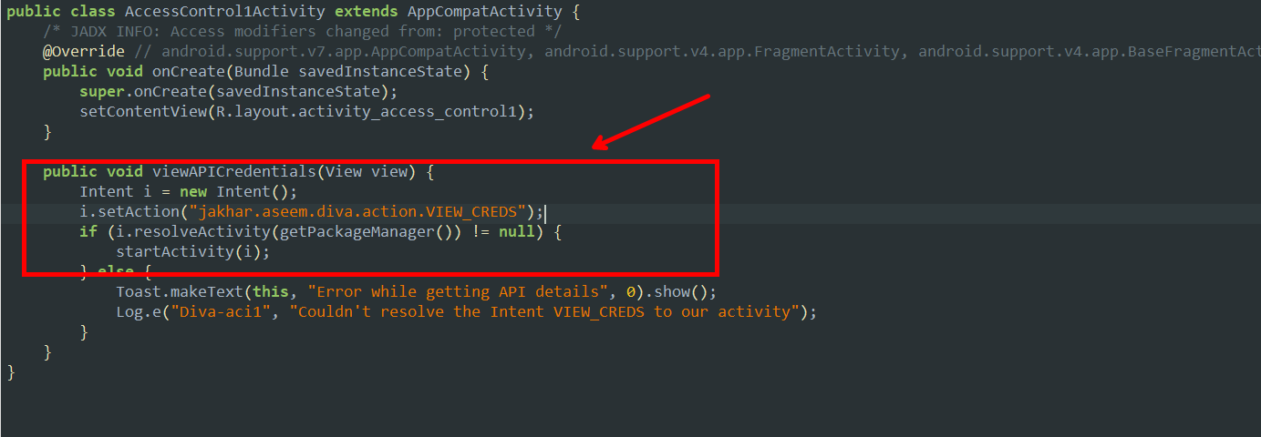3.일단 코드흐름을 살펴보기 위해 Jadx 로 디컴파일링 하여 소스코드를 확인해줍니다. AccessControl1Activity 의 코드를 살펴보았는데 Intent에 VIEW_CREDS 라는 액션을 실행시키는 것을 확인하실 수 있습니다. 이게 무슨 액션일까요??