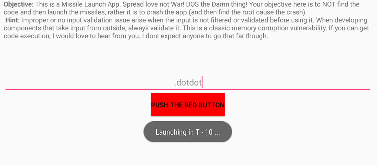 8. 그러면 충돌도 일으켰으니 아까 저희가 찾아냈던 비밀코드를 집어넣어 이번에는 미사일 버튼을 발사해보겠습니다! .dotdot 이라는 문자열을 삽입하고 실행시키자 Launching T -10 ... 라는 문구가 뜨는것을 확인하실 수 있습니다!!