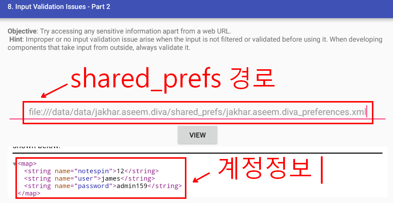 4. 그리하여 file:///data/data/jakhar.aseem.diva/shared_prefs/jakhar.aseem.diva_preferences.xml 라는 url 을 입력하여 앱 내부의 평문저장된 계정정보를 흭득한 것을 확인하실 수 있습니다.