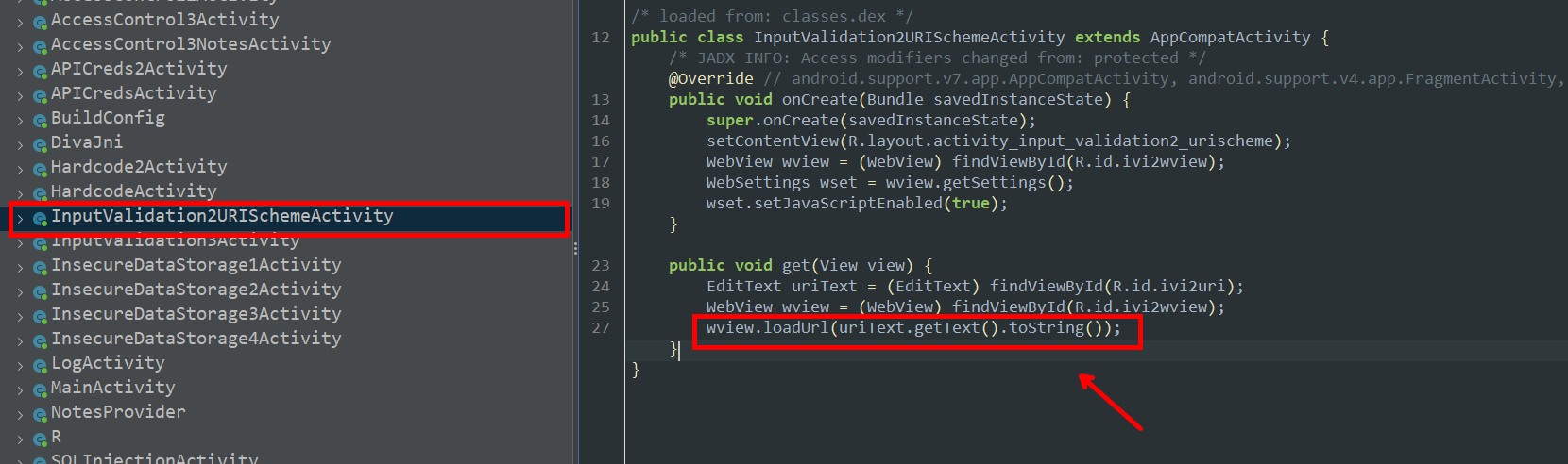 | 취약한 loadUrl 코드 부분 |