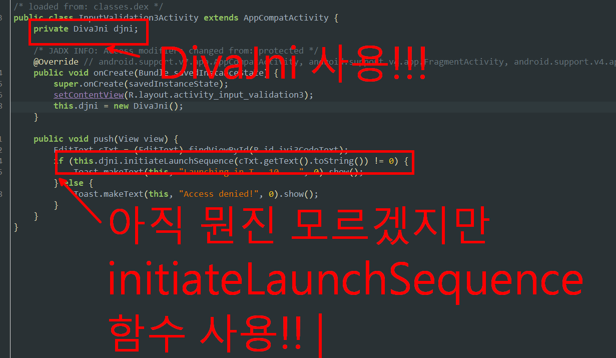 2. InputValidation3Activity 에 들어와 보면 이런 소스코드가 적혀있습니다. DivaJni 에 정의되어 있는 initiateLaunchSequence 라는 함수를 통해 입력값과 코드가 일치하면 미사일 버튼이 동작되는 방식인 것 같습니다. 그러면 DivaJni 가 어떻게 정의되어 있는지 한번 확인해보겠습니다.