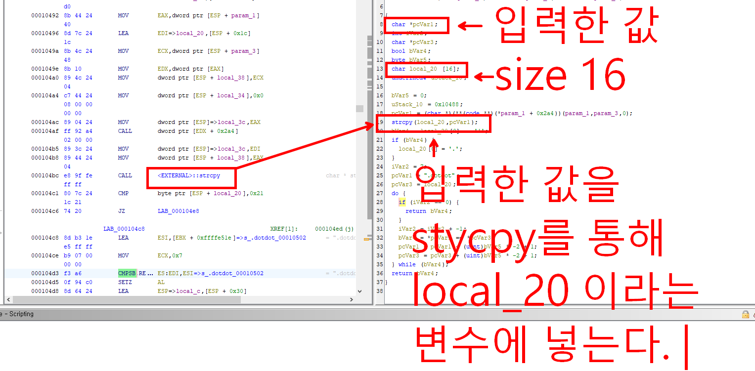 6. 이로써 비밀코드는 찾았지만... 문제의도인 앱을 충돌나게 하라는 부분은 아직 못찾았습니다. 하지만 코드를 살펴보니 이 함수에서 strcpy 라는 함수를 사용하고 있습니다. 저희가 입력한 값은 pcVar1 이라는 변수에 들어가고 그 변수를 local_20[16] 이라는 사이즈 16 짜리 문자배열에 strcpy 를 사용하여 저장합니다.