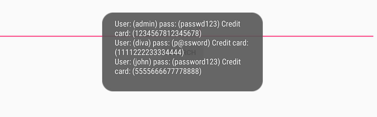 3. 디컴파일링 된 소스코드중 SQLInejectionActivity 라는 액티비티에 들어가보면 SQLite를 이용하여 유저 데이터를 만드는것을 보실수있습니다. 또한 srchtxt 라는 변수에 저희가 입력한 값이 들어가게 되고 , 이후 별 다른 필터링없이 저희가 입력한 값을 SQL query 문에 포함하여 Select 문을 실행시키는것을 보실 수 있습니다. (만약 사진이 깨져서 잘 안보인다 하시면 사진을 클릭하시면 깨끗한 이미지로 확인가능합니다!)