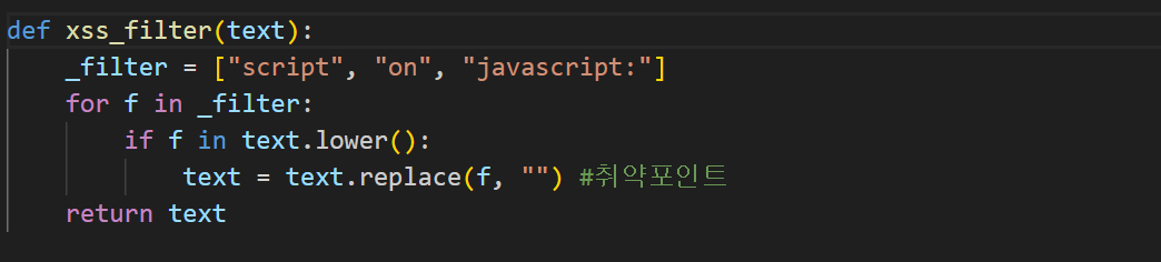 5. 소스코드중 xss_filter 라는 함수 부분입니다. 여기서 script , on , javascript: 라는 문구를 공백으로 처리하여 필터링 하고있습니다. 하지만 공백 필터링은 scscriptript => script 같은 방식으로 우회가 가능하다는 취약점이 있습니다. 따라서 이점을 취약점 포인트로 생각해볼수 있습니다.
